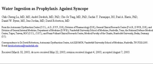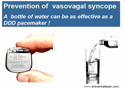 Water , (Simple H2O ! ) administered at right time in right quantity can prevent most episodes of vaso vagal syncope . When a tumbler of water can be substituted for a 10000 $ misadventure (DDD pacing) , and further we have hundreds of similar examples in modern day health care , no surprise why our health care system is sinking along with our economy !