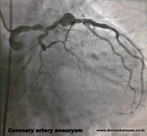 Here is a different facet of atherosclerosis , A middle aged man surprised us with this coronary angiogram . Instead of obstructing the flow the coronary vessel begins to dilate. This is due to a medial weakness .(The media for some reason begins to give way rather than proliferate to the atherogenic stimuli.)