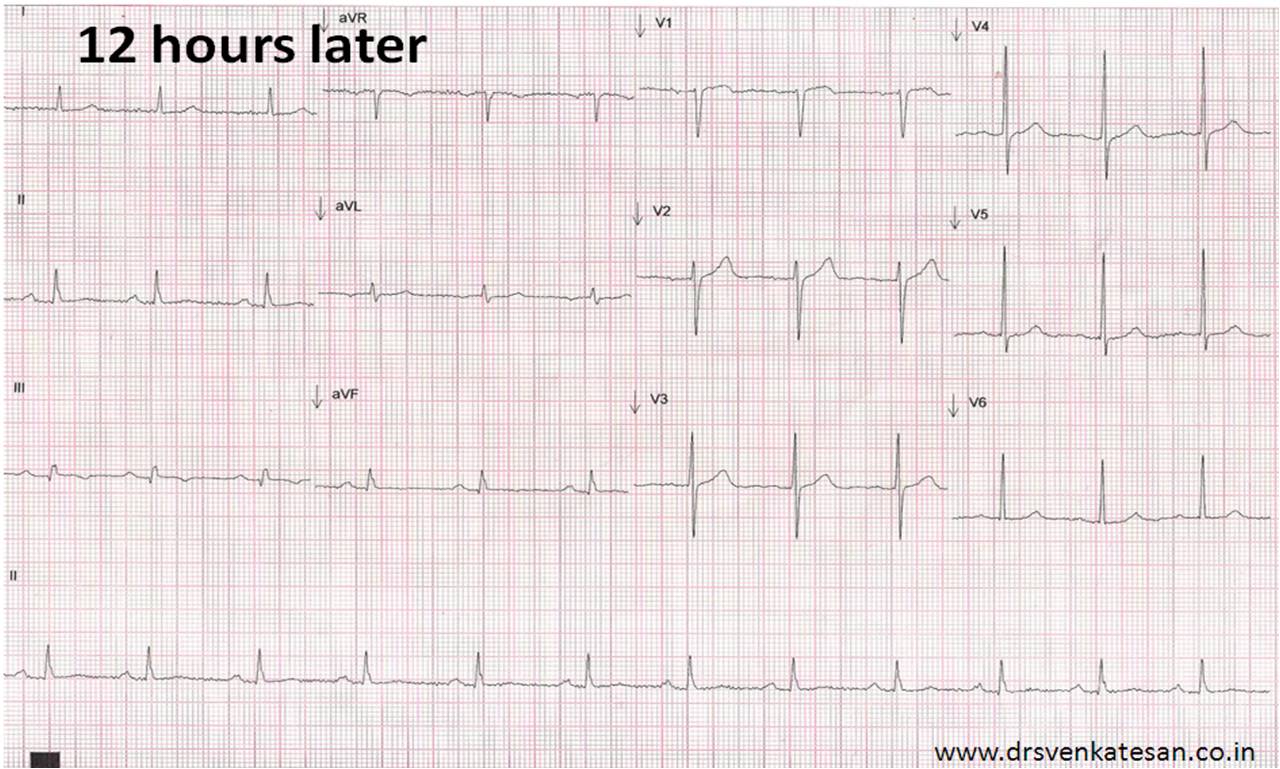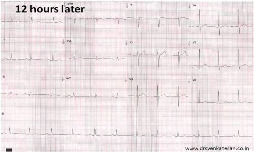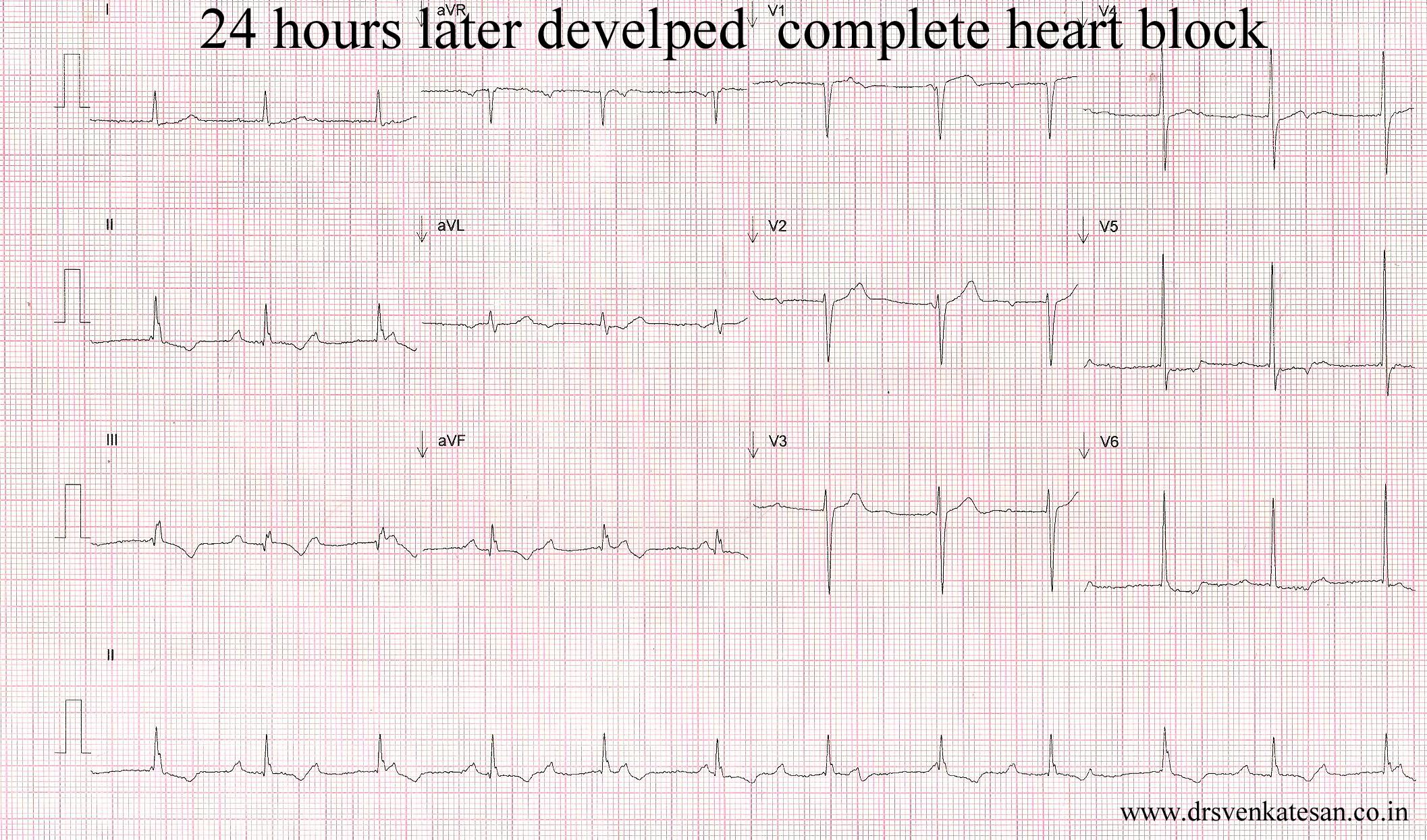 And now . . . after 24 hours a new complete heart block appear with classical evolved pattern of inferior MI.The most interesting feature is patient has been comfortable all along even as his posterior aspect of heart is experiencing terrible electrical earth quakes.