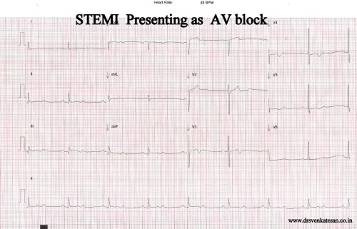 STEMI presenting primarily as heart block is less common . When such a presentation occurs extra caution is required.