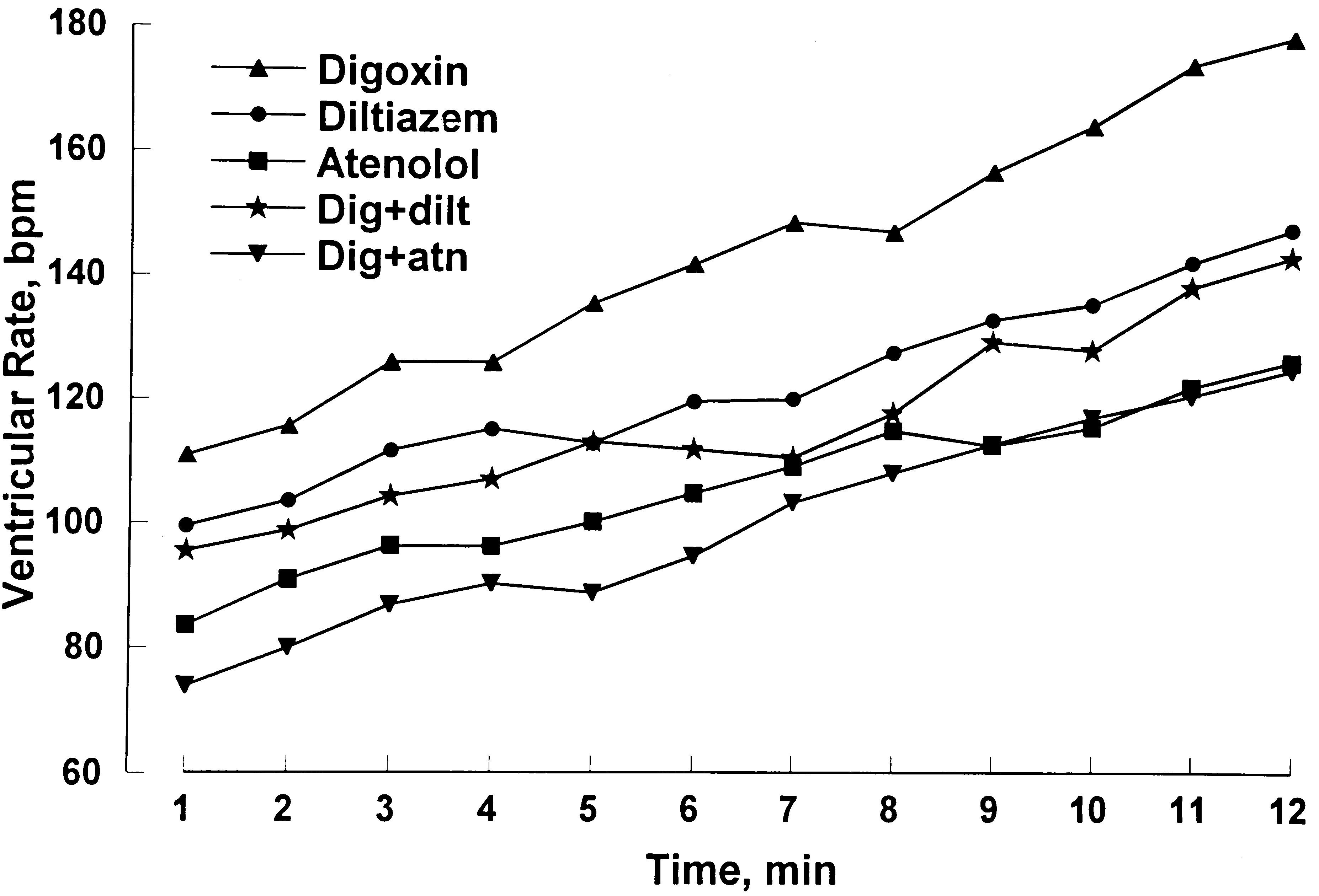 Digoxin + Atenolol is clear winner in rate control during exertion as well ! Note Digoxin has absoutely no control over the heart rate at times of exercise !