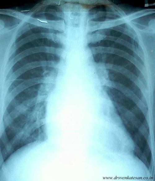 Here is an X-ray of classical rheumatic mitral stenois with a mitral orifice of .8 square cm.