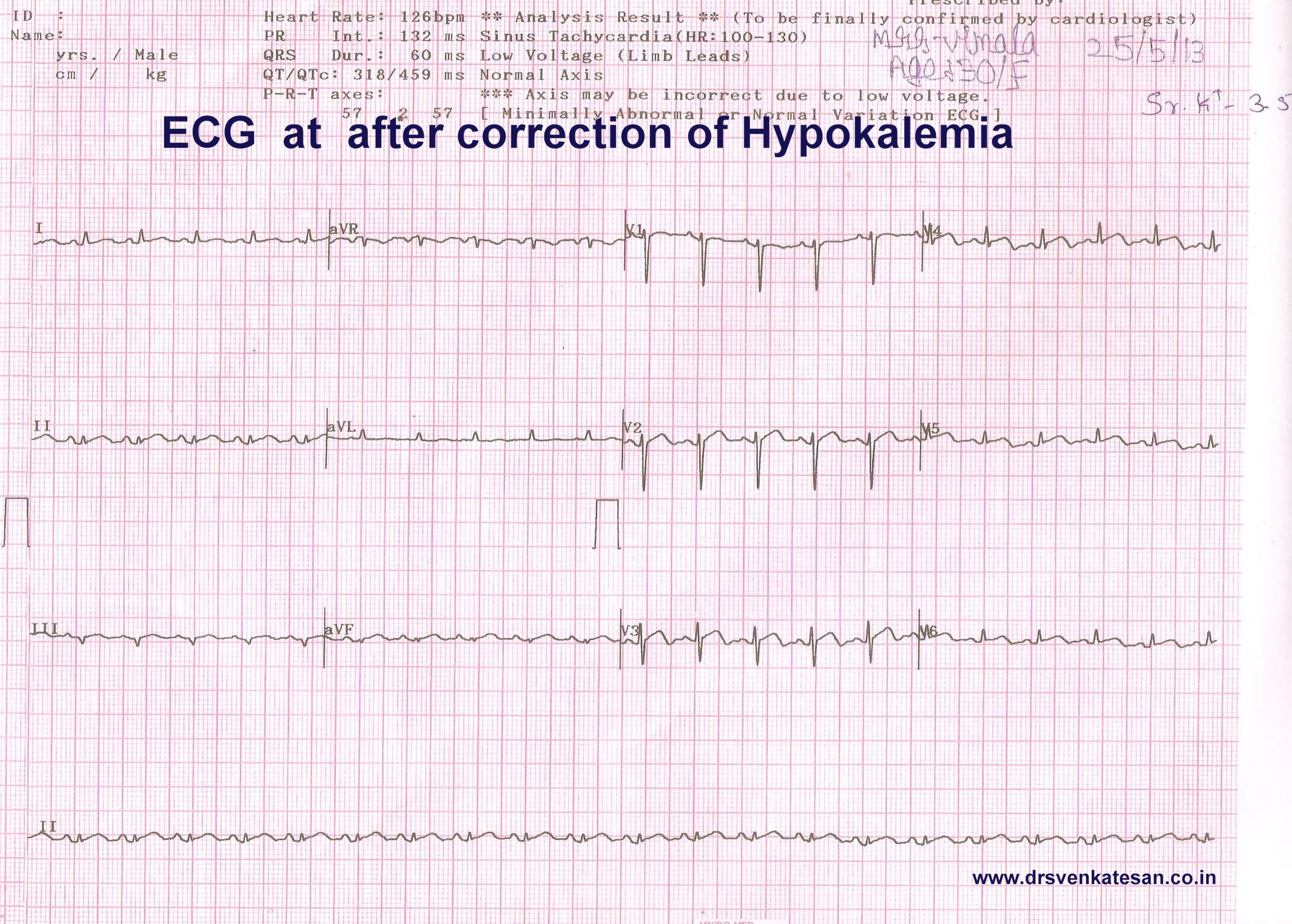 However , ECG changes are expected 100 % of time with falling K + especially below 3meq.Surprisingly , low K + levels have little mechanical impact.(Or is it our ignorance,considering the fact , cardiac electrical mechanical activities are tightly coupled?)We have to find answer from patients like this .