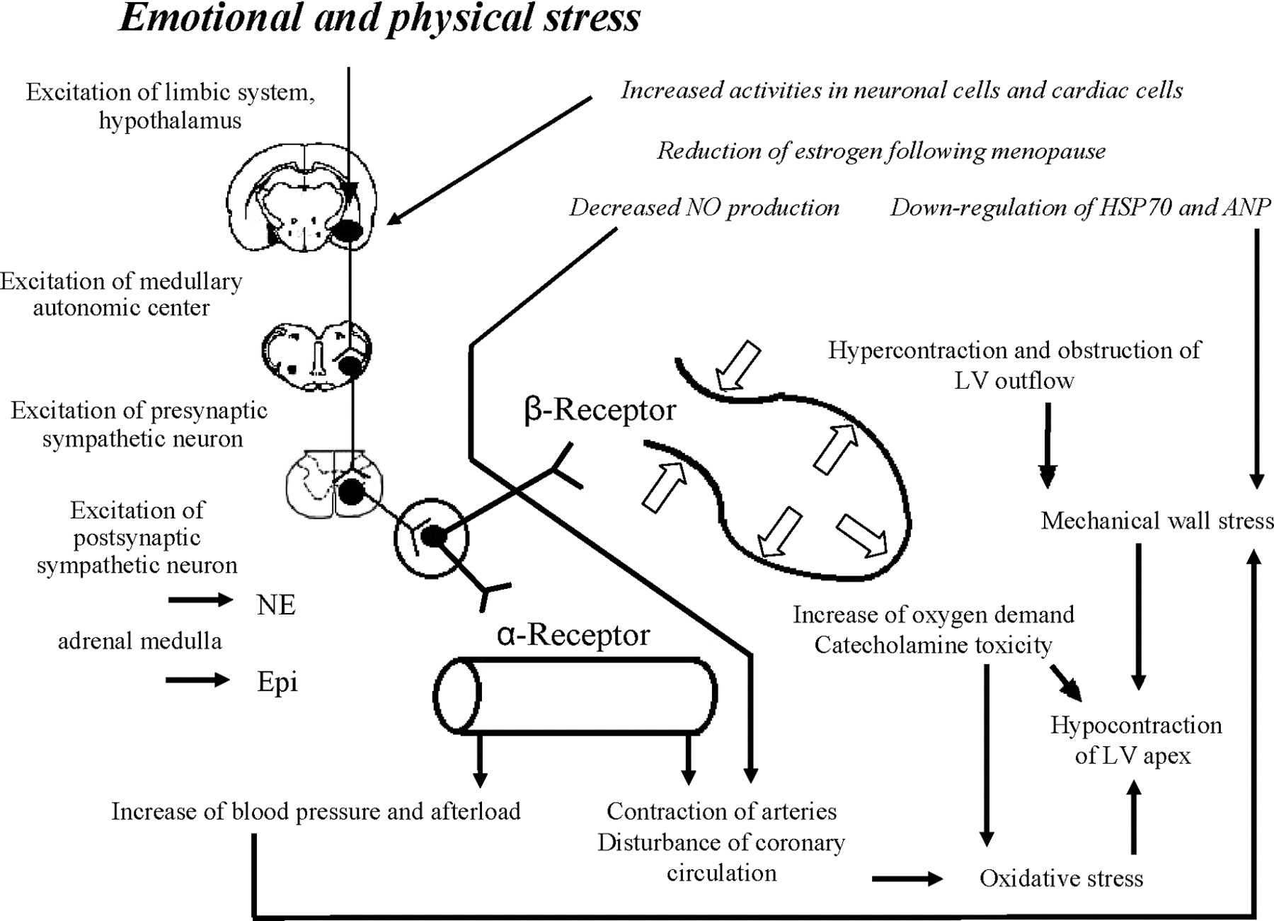 However , the most accepted mechanism is Endogenous catecholamine-induced myocardial stunning and microinfarction
