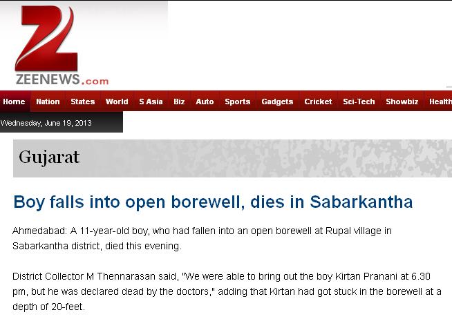 I made a mini google research. It is estimated thousands of bore-wells are dug every day and kept open in allover the country side .It is like live land mines . Some press reports suggest at least one child dies in India every day due to uncovered bore-wells and man holes ! (May be really true !)