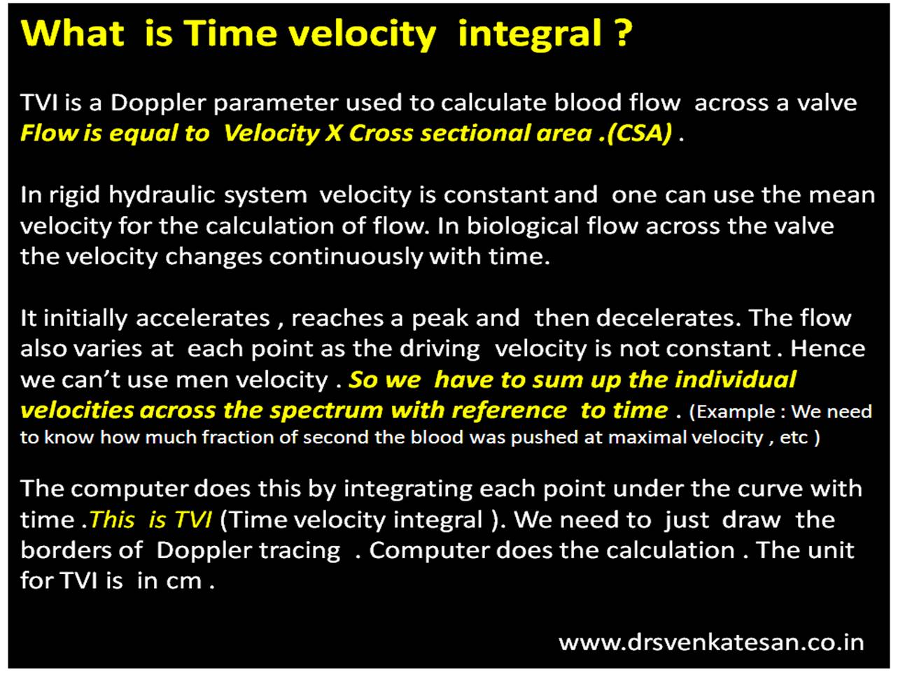 TVI (or VTI) is a hemo-dynamic echo parameter measured from Doppler spectrum across the valves ,usually in the outflow.This parameter is used to calculate cardiac output .VTI times the cross sectional area gives the stroke volume.