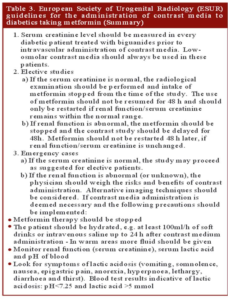 Though the incidence of Metformin induced Lactic acidoss is low , the outcome can be bad , hence the concern. The European society of urogenital radiology has provided clear cut guidelines regarding Metformin usage when contrast agents are being used.