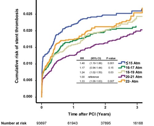 The effect of balloon pressures in the long term outcome. note both low and high pressure dilatation ( blue and orange worms ) hike the risk of restenosis. Too gentle is as dangerous as too harsh making post dilatation a secret and unique art.
