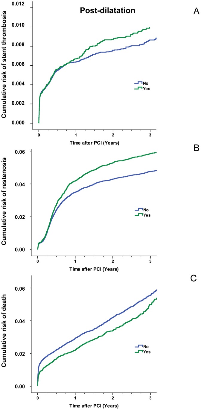 Estimated cumulative event rates of stent thrombosis (Panel A) Restenosis (Panel B ) Cumulative death (Panel C) in relation to post-dilatation .Note the height of coronary Irony, Post dilatation Increase stent thrombosis and restenosis but saves life too !