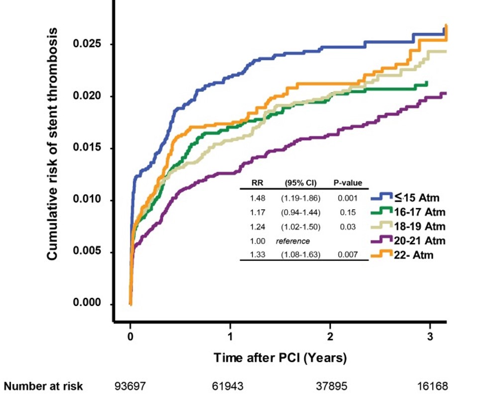 The effect of balloon pressures in the long term outcome. note both low and high pressure dilatation ( blue and orange worms ) hike the risk of restenosis. Too gentle is as dangerous as too harsh making post dilatation a secret and unique art.