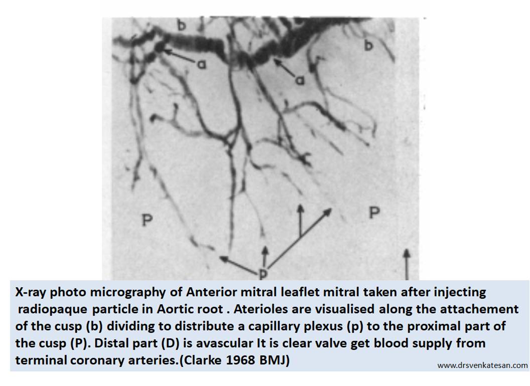 It is academically humiliating to note we have to go back 50 years in time to get a proof for vascularity in cardiac valve.(Or anything new I am missing ? readers may share !) I think , this is strongest proof  for valve cusps are supplied by end coronary arteries. However the penetrance is not deep into all layers of the valve and distally