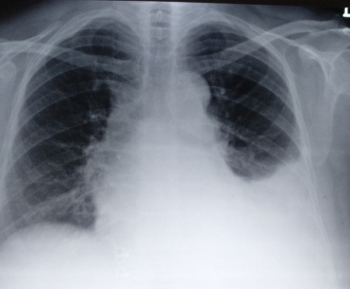 This patient came to my lab for the Echocardiogram .The echo window was poor , It showed a structurally normal heart and there was no pericardial effusion. I suspected something systemically wrong in this patient and asked for a X ray chest .