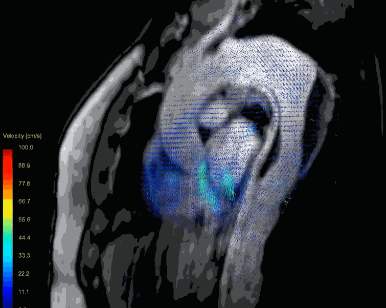 (4D Phase-contrast MRI showing slow helical flow in the false lumen and high-velocity flow in the true lumen. Computational flow dynamics will help assess entry point, plane of dissection, calculate false lumen Index, pressure and wall stress in true lumen and Aortic branch compromise etc . Image courtesy. The Lancet Volume 385, Issue 9970, 28 February–6 March 2015, Pages 800-811)