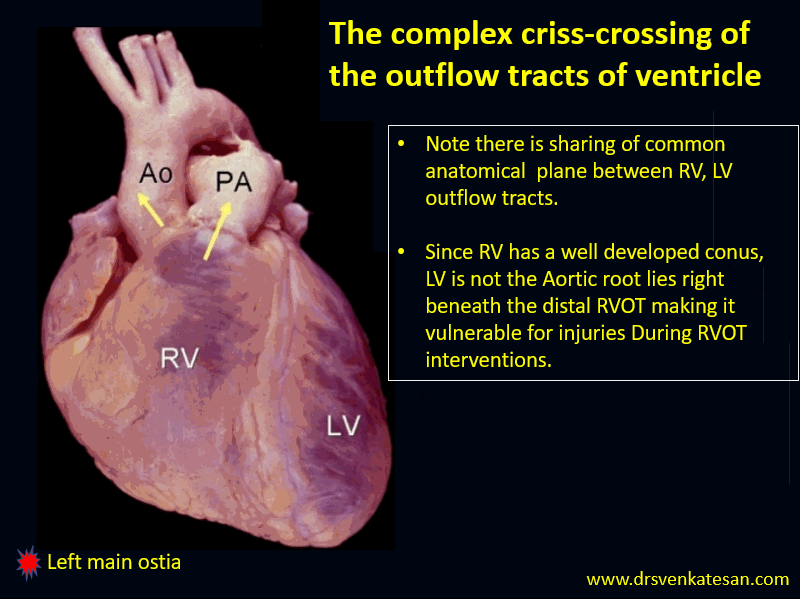 If you think coronary artery ostia are exclusively related to LVOT, and they nowhere come closer to RVOT, we are seriously wrong for some hidden anatomical reasons. Though, Its a well recognised anatomical reality , we had to learn it from EP labs during the ablation of RVOT VT. The left main ostium is at equal (If not more ) at risk as we ablate across RVOT.The reason being the complex twist God conferred on the outflow tracts of heart.