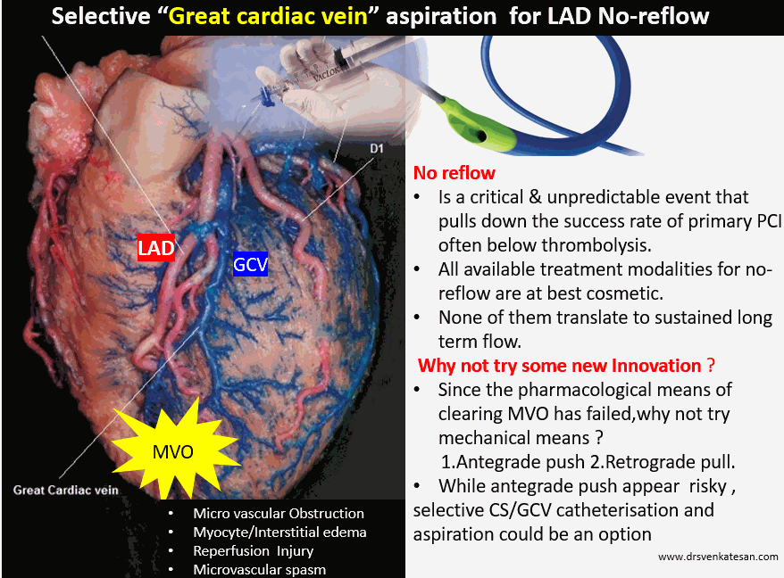 2. The second option is again mechanical but uses negative pressure to suck from the far end of microcirculation. We can pull the debris into the coronary venous circuit by using vacuum suction deep inside the main stem of the coronary sinus or even the great cardiac vein, the venous counterpart of LAD. This appears to be more comforting to the coronaries at least theoretically. (Never under-estimate the power of vacuum as a biological Intervention.I recall tender newborns pulled out with massive vacuum pressure without any issues during my O&G days)