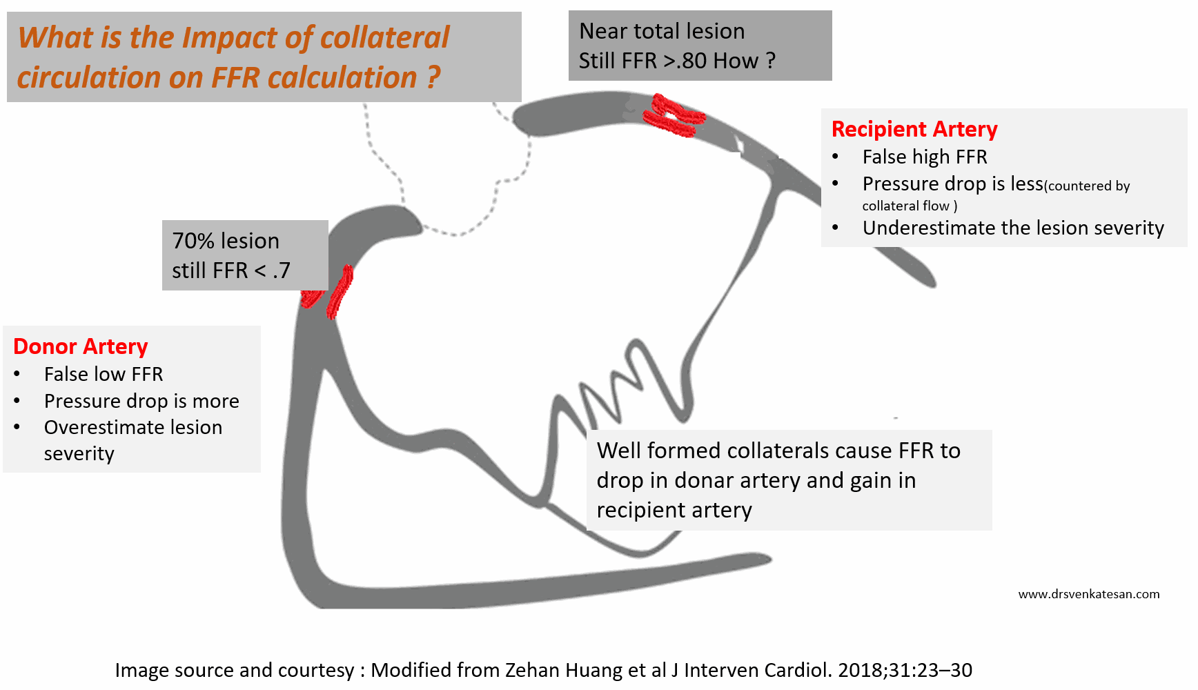 When a vessel in question, is supplied by well-formed distal collaterals, it will prevent this pressure drop and hence lesion is underestimated. Similarly, if the donor artery has a suspicious intermediatory lesion, the FFR across it is falsely low, and overestimates the lesion.The distal pressure drop here is not because of the lesion but due to rapid collateral flow into the recipient artery.