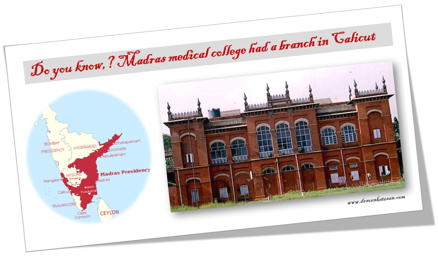 I stumbled upon this unique historical info about my college. *According to Prof. Emeritus M.G. Sahadevan., F.R.C.P. (London), the first medical college of Kerala was started at Calicut, in 1942-43, during the Second World War. Due to a shortage of doctors to serve the military, the British Government decided to open a branch of Madras Medical College in Malabar, which was under Madras Presidency then. The Medical School was started close to the then district hospital at Kottaparamba ( now Women and Children’s Hospital).