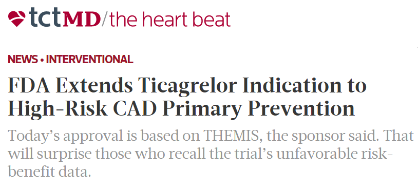 It’s all happening. FDA approves Ticagrelor for high-risk cad primary prevention and stroke. I am sure, even Astra Zenica wouldn’t have expected this. At best, the evidence from THEMIS for this Indication, can be called as a statistical extrapolation of comical proportion.