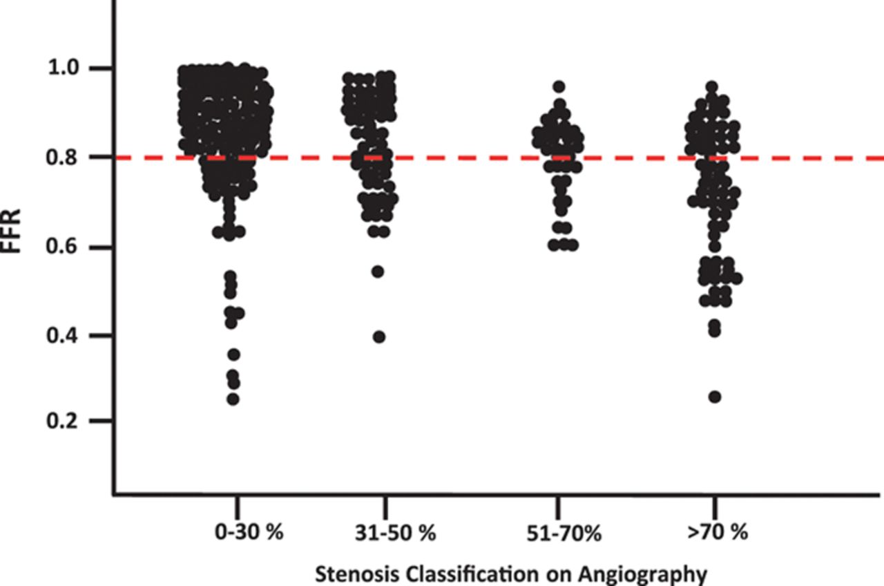 Relationship between diameter stenosis snd FFR. Note, even a 30% lesion can have a low FFR, and a 70% lesion show the FFR to scatter on either side of the cut-off value .8 . So, what does it mean? We have simply shifted our ocular bias to objective flow bias. Does Routine Pressure Wire Assessment Influence Management Strategy at Coronary Angiography for Diagnosis of Chest Pain? The RIPCORD Study Nick Curzen circulation cardiovascular Interventions 2014.