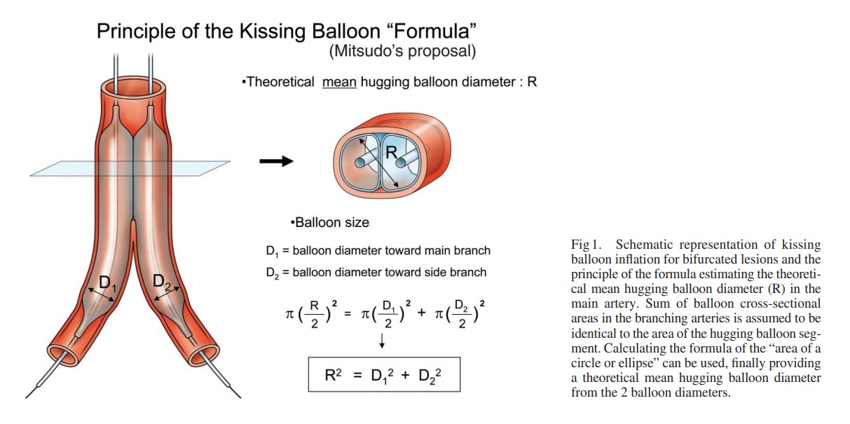 The physics of bifurcation kissing includes balloon hugging diameter, area, and pressure. Added to that is the intervening metal layer.