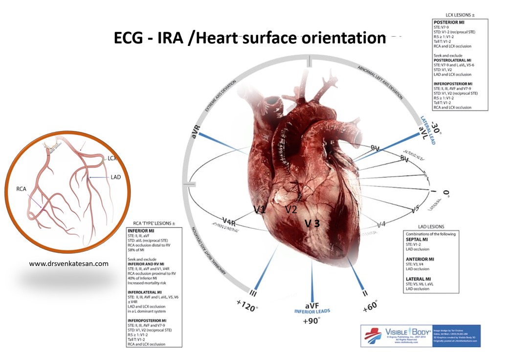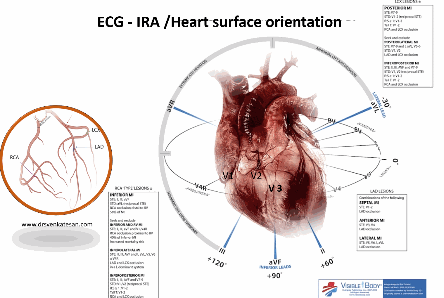 This illustration helps us to understand, ECG lead orientation, and coronary arterial territory, IRA localization with reference to the various surfaces of the heart. (Courtesy of visible body-modified ) Always remember the heart is an organ, made up by a complex fusion and rolling of bundles of muscles over a fibrous skeleton. It has multiple surfaces. Please avoid calling various surfaces of the heart as walls(Request the young medical students to un-tune their brain, from the inherent tendency to Imagine the heart as a well-demarcated four-chambered concrete structure built with bricks !)