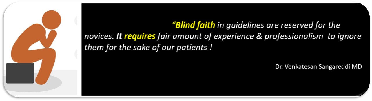 To insist, that a particular technique must be followed may not be academically correct always. It is similar to telling a coach driver in advance when to apply a brake or accelerator when he is negotiating multiple hairpin bends in hilly terrain on a rainy day, based on clinical trials done with different drivers on different routes. Ultimately, the outcome is decided by the expertise of the driver, the condition of the vehicle, the road, and not least, the destiny of the passenger.