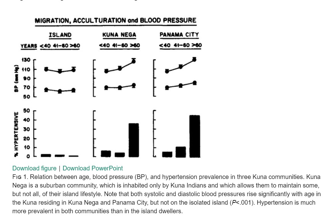 As Kuna’s moved out from their primitive lifestyle to first, the Kuna Nega,(a suburb) and subsequently to a fast-paced Panama city. See the impact on their systole and diastolic stress on the heart. The loss of protective effect of the native diet is obvious.