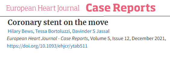 1.Bews and others, Coronary stent on the move, European Heart Journal – Case Reports, Volume 5, Issue 12, December 2021, ytab511, https://doi.org/10.1093/ehjcr/ytab511