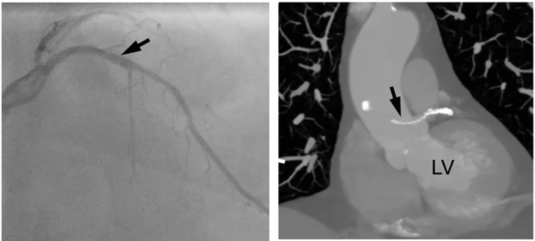 A LAD stent migrates retrogradely into the aortic root crossing the left main ostium. Image source and courtesy Hilary Bews and others, Coronary stent on the move, European Heart Journal – Case Reports, Volume 5, Issue 12, December 2021, ytab511, https://doi.org/10.1093/ehjcr/ytab511