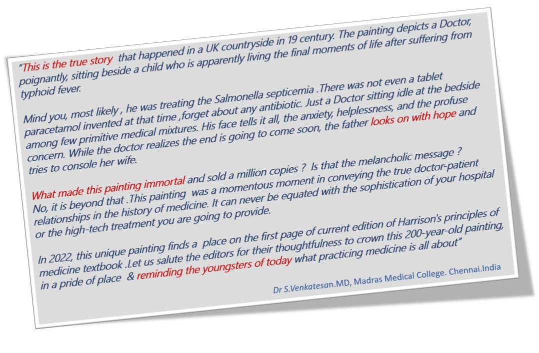 No medical painting Impacted us this much. “The Doctor““was exhibited in 1891 by Sir Luke Fildes and Presented by Sir Henry Tate in 1894 in London. I am sure most of us are aware of this painting. Sharing it for future generations. Wish, this painting is embedded permanently in every young medico’s nimble brain.