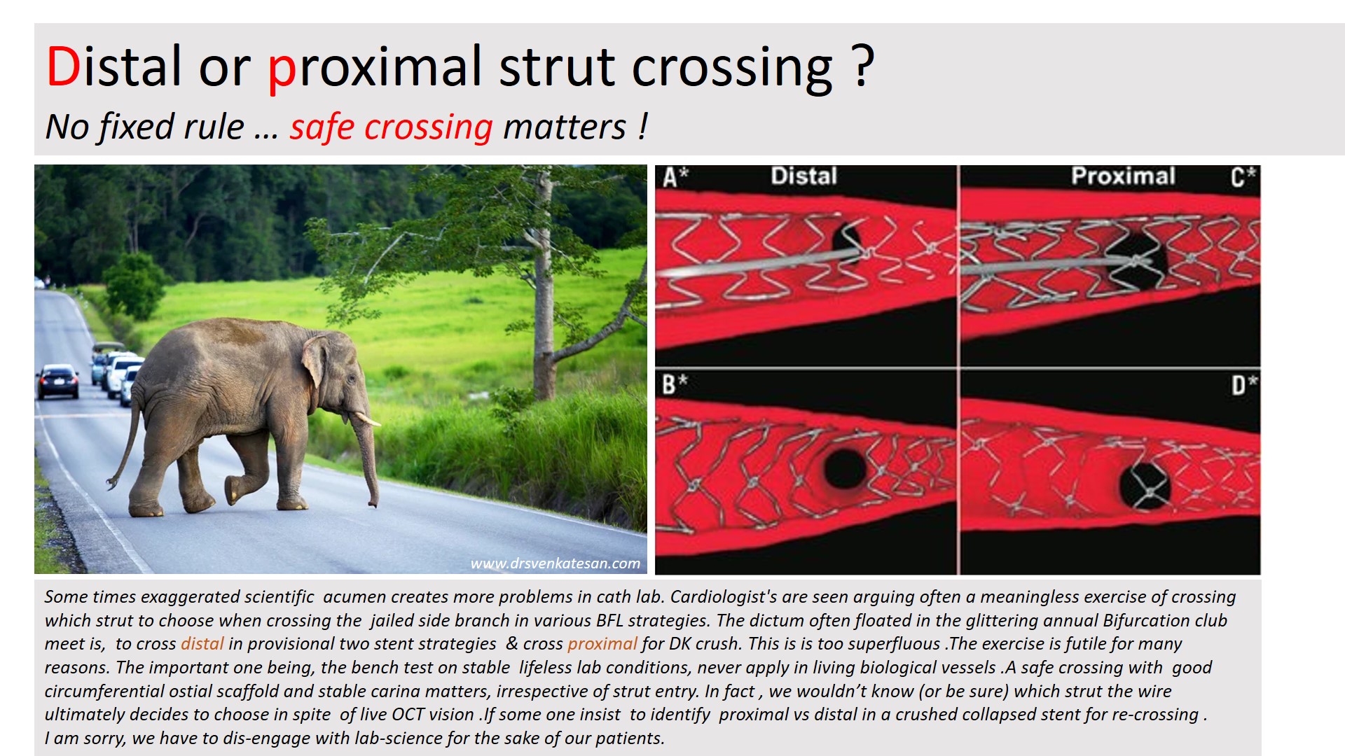 We are all talking about theory in bench testing in stable non-hemodynamic conditions that lacks a biological carina and the dynamics of plaques. We are aware that there are at least 5 virtual ostia in every bifurcation arena (or trifurcation) . The qunatum and direction of plaque sharing occurs with a random effect. We also know the final kissing either cements these plaques perfectly or unsettles in a most bizarre way. So, these strut crossing stuff, are more of an imaginary bio-engineering principles. Whichever strut you cross, do it slowly, gently dilate it to the maximum within the polygonal confluence and good approximation. Don’t get too much carried away , even live online OCT guidance do not guarantee a perfect crossing.