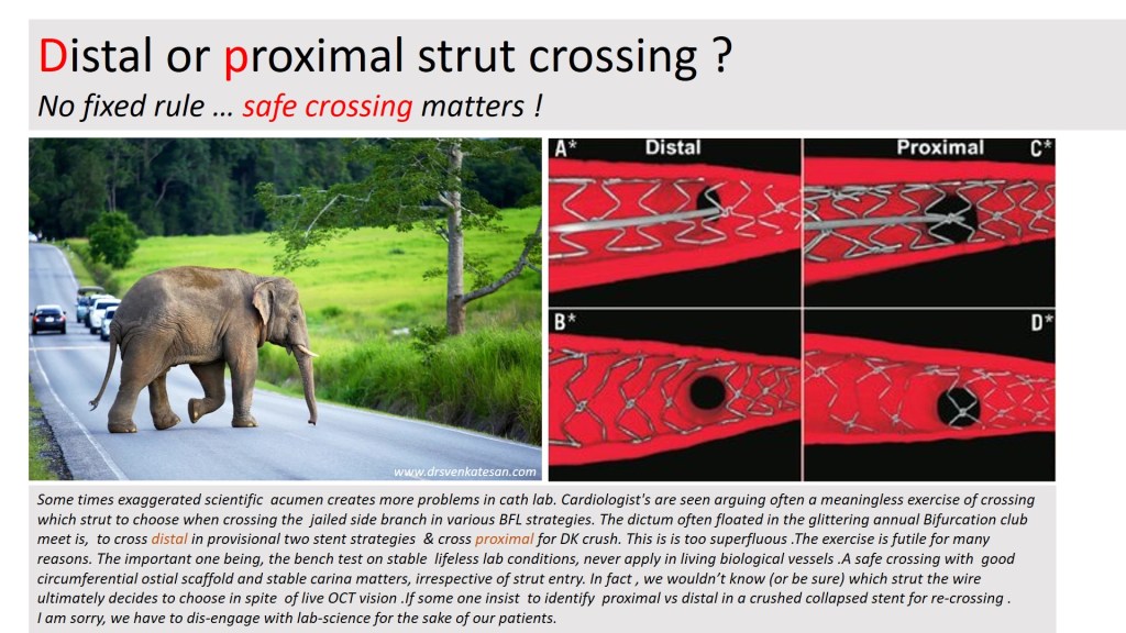 The answer to the title question seems to be (me), one need not hair-split much on the site of crossing at the side branch. Fortunately, in whatever way, we weave the metallic mesh*, at the epicenter of the coronary highway, it is the natural secretagogues like TPa, Nitric oxide, PGI-2, along with DAPT decides the patient’s genomic fate.
