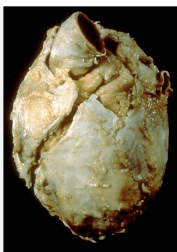 Macroscopically ,It would be a dramatic sight to see the heart caged within hard shell of pericardial mass. To be frank, we can never make a distinction between the three layers once its thickened. Which layer is the triggering force, that promotes adhesion and compression is also not clear. We presume, the thick fibrous layer is villain de chief. (This we learnt , by observing rheumatic heart disease pathology ,wherein pericarditis , never evolve into constriction as it doesn’t affect the thick fibrous layer) .The inflamed exudative pericardial fluid doubling up as a glue to stick all three layers is a true possibility.