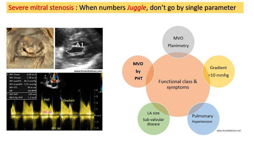 Though we are used to 1 cm² MVO cutoff , we can’t hang on to it strictly. Mind you, even a small gain in orifice can give a dramatic improvement in functional life. We have come across instances of splitting a mitral valve from a patient .8 to 1.5 cm² (technically they are still in severe MS), walking home briskly with a thankful smile. Same thing may happen for a patient with apparently moderate MS, right !