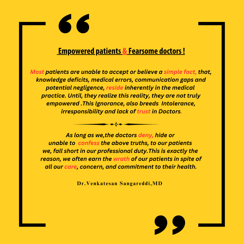 The problem with many patients are ,they are unaware, that doctors often practice medicine with incomplete knowledge. To be very frank, many times it turns out to be , sort of therapeutic experiment with inherent risk at every stage .The present day patients want to know ,what the doctors themselves do not know.