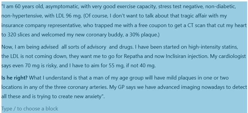 LDL is not only the enemy of the coronary artery. Fatty streaks in the coronary artery begin in the fetal stage itself. In adults, some of these streaks become prominent locally and turn out to be plaque. The argument for intensive statin therapy is to stabilize these plaques. We would not know if the plaque is stable or not. We can’t do OCT imaging, an invasive test, to know about the vulnerability. So, for the sake of safety, everyone advises intense statin therapy. The irony is ACS continues to occur at any level of LDL.