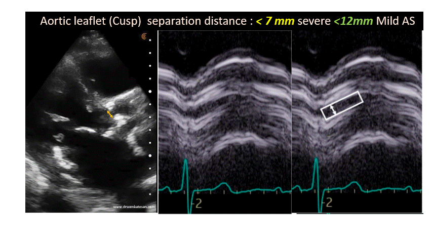 Maximal cusp separation distance is a quick way to assess the severity of AS, that avoids the doppler angulation errors. Further,i f we can take cusp separation distance as the diameter of the aortic valve orifice, ( assuming it is a circle) , then we can straight away calculate the EOA. using πr². Some one should do this analysis.