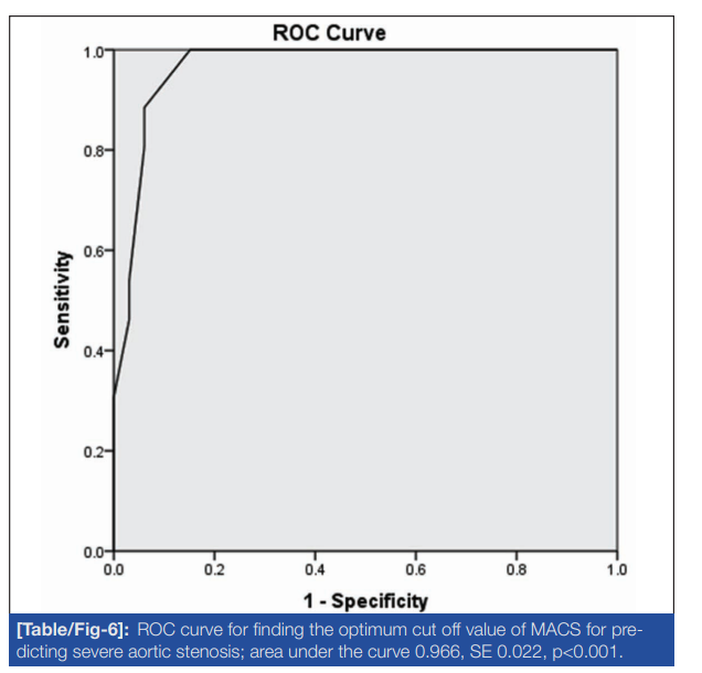 Mximal aortic leaflet separation (MACS) in M mode was identified as the distance between the inner edges of the tips of these structures at mid systole in the parasternal long axis view. Cuspal separation is also measured in 2D echocardiography from the parasternal long axis view and the average of the two values was taken as the MACS. 2D is more reliable than M-Mode. One might make it further simple by taking only 2D measurment. (In one way. it can be thought of as a 2-D equivalent to of vena- contracta in regurgitant lesions)