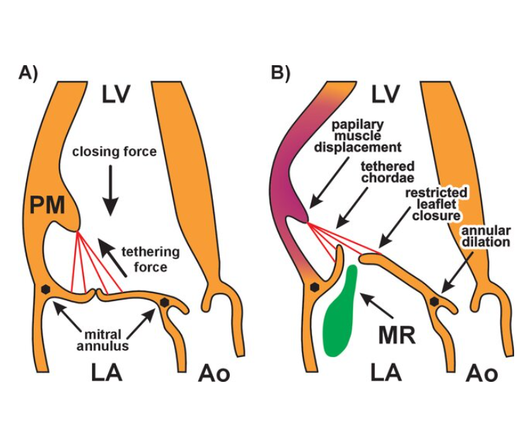 Image source : Barbara Brzezińska and Krystyna Łoboz-Grudzień from the Book : Structural Insufficiency Anomalies in Cardiac Valves Mechanism of functional mitral regurgitation. (A) Balance of closing and tethering forces acting on mitral leaflets during systole. (B) Disrupted balance of closing and tethering forces due to local LV remodeling (dark shading). LA: left atrium; LV: left ventricle; PM: papillary muscle; Ao: aorta; ME: mitral regurgitation.