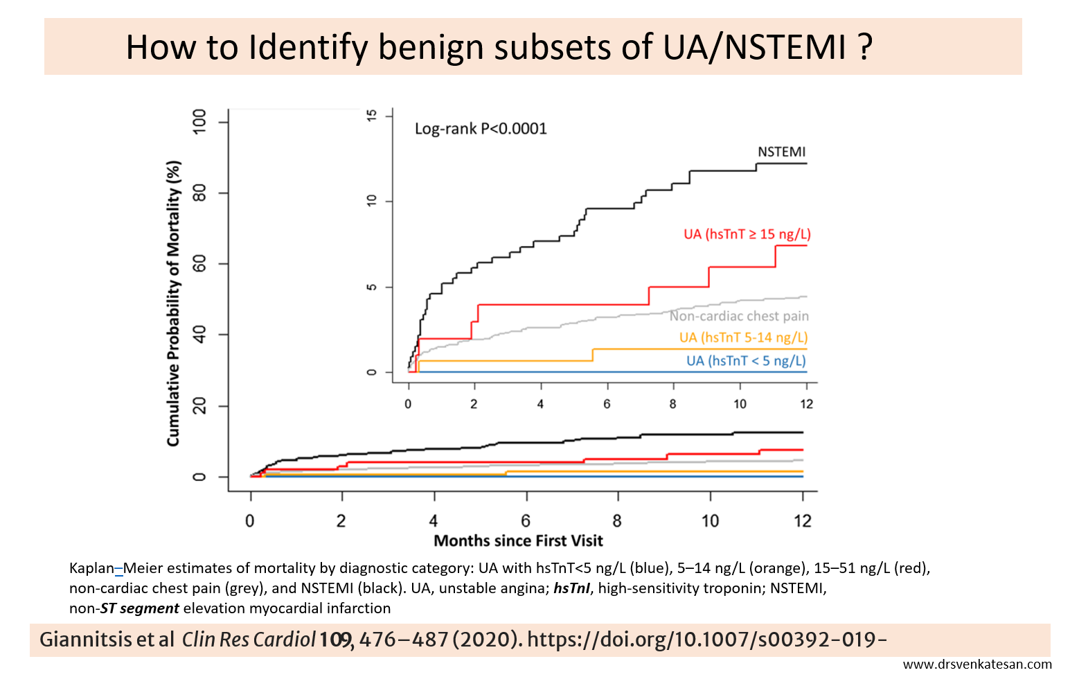The high sensitivity troponins not only help us to diagnose NSTEMI, it also tells us which one of them may be innocuous ACS or benign ? Strangely, we are also taught , “No ACS should be considered benign, until you see the coronary anatomy”. I wish patients realise, how difficult it is to practice cardiology, for that matter any field of emergency medicine. You can’t err at the same time , you are not supposed to treat inappropriate as well.