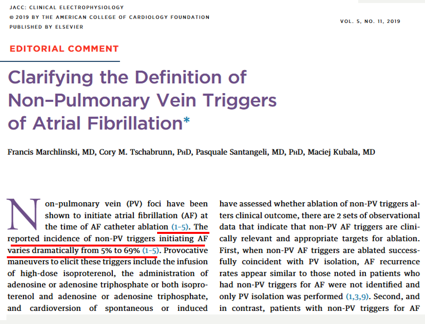 For right or wrong reasons, the world of electrophysiology has pushed us into a belief system that, if it is AF, the culprit must be pulmonary veins. In fact, non-pulmonary vein origins can be a staggering 70% in some series. (See below) It can be in the free walls of the left atrium, LA appendage, IAS, IV, SVC junctions, coronary sinus, ligament of Marshall, crista terminalis, etc. (Ref 2)