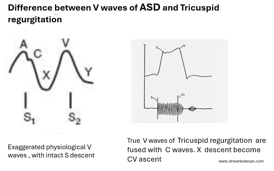 While Y descent is prominent in both ASD and TR ,the X descent in TR is lost for simple reason. tricuspid valve is leaking and TR jet abolish the systolic X descend, rather it becomes a X-ascent (Conventionaly called CV waves)