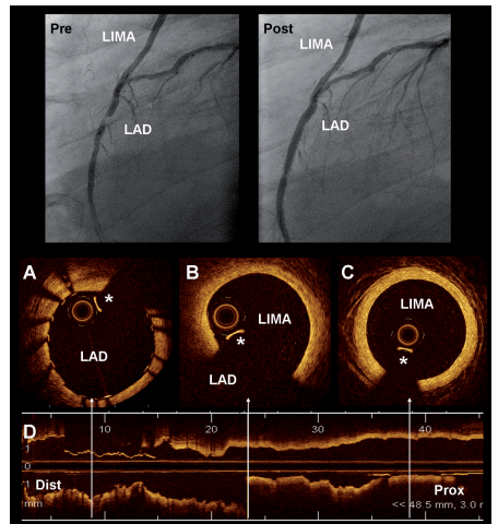 Image source & Courtesey : Ref 1 Optical coherence tomography (OCT) visualisation of left internal mammary artery (LIMA). The superior panel shows the angiogram of a patient with a graft of LIMA to the LAD.