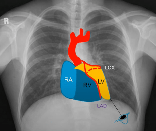 The yellow Zoneis a wide area between LAD and LCX that engulfs the whole left ventricle. The blue zone is the anteriorly placed RV, especially the RVOT, which comes closer to the left main. The one below the LCX is the posteriorly placed left atrium depicted in green zone. (Not in above picture)