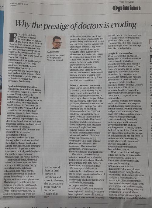 Sharing here , one of the deeply reflective article about, reality of being a doctor today. Published in today’s Hindu, (July1 2025)India’s National New paper, Opinion Column by Dr C. Aarvinda . It is a 6 minute read, must for all those who truly love our profession.