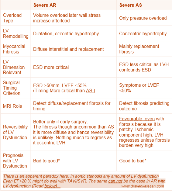 Patients with severe AR generally exhibit better reversibility and prognosis post-surgery compared to those with AS, (Ref 7 : This study found patients AR tend to have more diffuse fibrosis, which exhibits better regression after valve surgery compared to the focal replacement fibrosis in pressure overload conditions (like AS). This suggests better reversibility of LV dysfunction in AR) This finding is an apparent paradox, since we think LVH is more likely to have fibrosis.