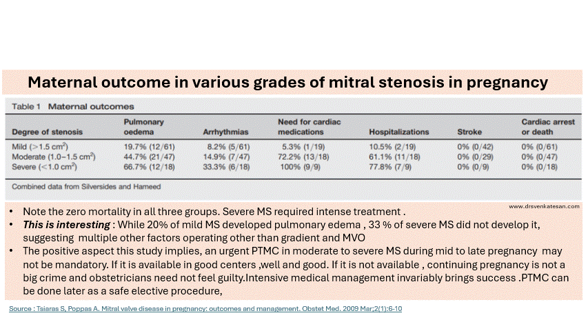 Many cardiologist might feel it is scientific to watch a young women with significant MS lying quietly looking ahead a uncertain labor. This is more of our respect to science than the true hemodynamic reserves these women have*. If the facility and expertise to do PTMC is readily available, well and good. If it is not, need not feel guilty and panicky . Track record reveals even severe MS rarely leads to a catastrophe. Thanks to the dramatic resilience of our young pregnant women with an agile cardiac and vascular reserve and also the advanced cardio vascular support drugs and gadgets.