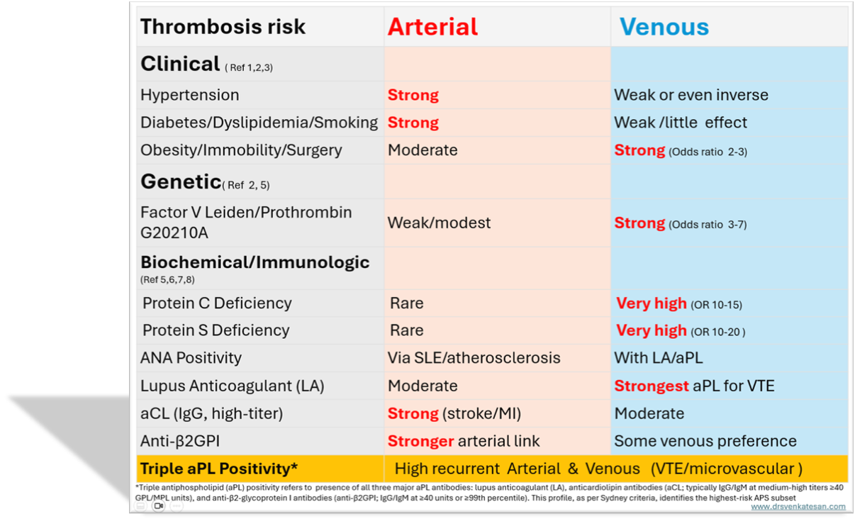 I think we need to engage the hematologist more often because thrombosis is not only due to excess coagulation. It is also due to a lack of enough circulating anticoagulants. (As a cardiologist, sometimes I feel awkward. to call myself an expert of the circulatory system, with almost zero knowledge of how the blood clots or dissolves.) This article tries to differentiate the risk factors operative on the venous and arterial sides. It is only a gross attempt; many risk factors are invisible and are common between arterial and venous thrombus.