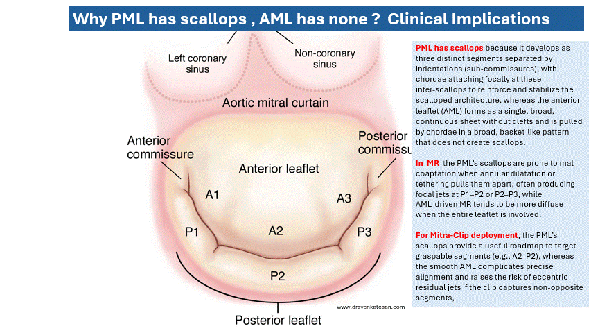 When discussing the anatomy of the mitral valve, many of us get a confusion regarding these A 1, 2, 3 , P 1,2,3 stuff . Is the mitral leaflet really has sub-cm clefts or interuptions , that form the popular terminology mitral scallops .If so how long , these clefts go ? If it goes deep. will it not potentially the mitral valve look a tricupid ? Yes, every thing is possible . But ,It is very important to realise AML has no scallops and indentations, while the PML has distinct sub-commisures that make the well defined three scallops. The so called A 1, 2, 3 are just corresponding segments with reference to PML. Current day cardiologists are supposed to specify , segment or scallop orieneted MR jets . 3-D echo makes it possible. Also live, online TEE( with a good interperator) in cath lab has become essential in cath lab during mitra- clip procedure