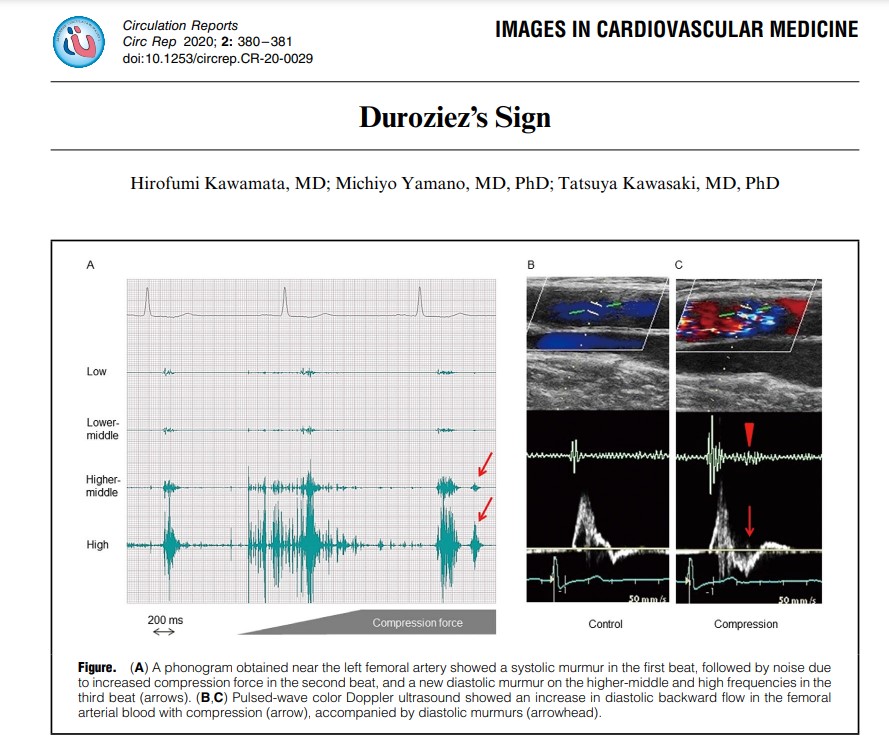 Though it’s of historical interest, it is still discussed in exams. It may be amusing for the busy clinical cardiologist to auscultate over the legs, when they may be contemplating a TAVI for leaky Aortic valve (Arias EA, Interv Cardiol. 2019). But, for students, it is a different story. If anyone wants to beat the acumen and curiosity of Duroziez, they may assess the length of this murmur and correlate it with descending aortic flow reversal, aortic ERO, and regurgitant fraction. The fate of Duroziez’s murmur after Aortic valve replacement may also be studied.